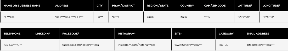 OGNI DATABASE EMAIL AZIENDE E’ COMPOSTO DALLE COLONNE: Nome o Ragione Sociale, Indirizzo, Città, Provincia, Regione, Nazione, Cap, Latitudine*, Longitudine*, Telefono, Profili Social* (Linkedin – Facebook – Instagram), Sito Internet*, Categoria di Business e Indirizzo Email.